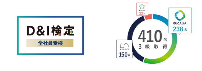 さらにDEI推進のため、株式会社JobRainbowが提供している「D&I検定」の受検をユカリアグループ全体で進めており、2025年11月末までに「D&I検定3級」を株式会社ユカリアの全社員、グループ会社の株式会社あいらいふ、株式会社クラーチの社員合わせて410名が取得するなど、LGBTQ+に係る取り組みに注力しています。今後も多様な人材が活躍できる職場環境を整え、誰もが自分らしく生きられる社会の実現に貢献します。